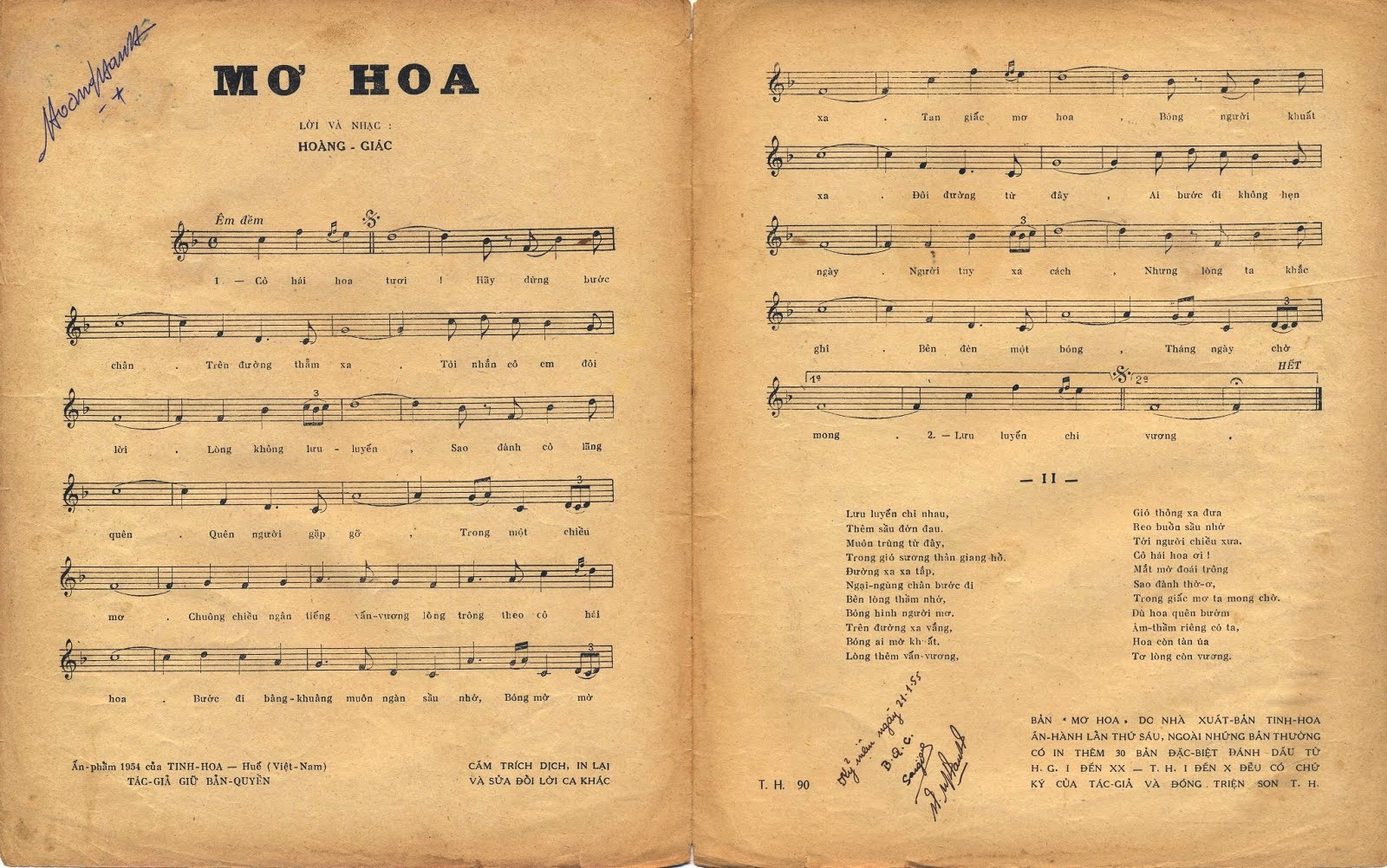 Những rung động đầu đời trong trẻo đã dẫn lối cho ông vào đề một cách rất tự nhiên “Cô hái hoa tươi, hãy dừng bước chân/ Trên đường thầm xa, tôi nhắn cô em đôi lời/ Lòng không lưu luyến, sao đành cô lãng quên/Quên người gặp gỡ, trong một chiều mơ”. Thế nhưng điều ít ai ngờ là khi nhạc sĩ Hoàng Giác chưa bao giờ có dịp bày tỏ lòng mình. Và chàng sinh viên lãng tử ấy đã gửi gắm tất cả lòng mình vào bài hát đầu tay của mình. Những tưởng khi ca khúc Mơ Hoa được hoàn thành, chàng lãng tử Hoàng Giác sẽ có trọn trái tim người trong mộng thì cô gái kia đã trở về Hà Đông và kết hôn với một người đàn ông ở làng lụa Vạn Phúc. Giấc “mơ hoa” ấy của nhạc sĩ Hoàng Giác bất thành nhưng ông đã đặt những dấu ấn đầu tiên của mình trên con đường âm nhạc. Và có lẽ chính ông cũng không thể ngờ rằng ca khúc đầu tay ấy của mình lại là chiếc cầu nối đưa ông đến với tình yêu và hạnh phúc đích thực của đời mình.