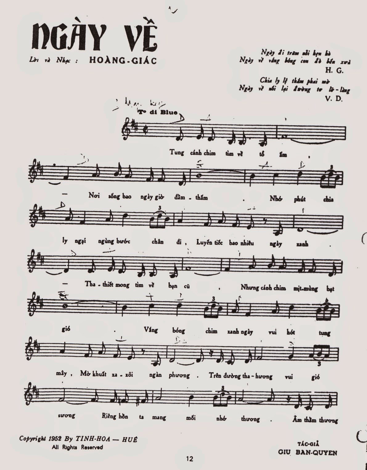 Thế nhưng vẫn chưa hết những thăng trầm trong cuộc tình đẹp như mơ của hai ông bà, 15 năm sau ngày cưới những ca từ tuyệt đẹp của tuyệt phẩm “Ngày về”: Tung cánh chim tìm về tổ ấm/Nơi sống bao ngày giờ đằm thắm/Nhớ phút chia ly, ngại ngùng bước chân đi/Luyến tiếc bao nhiêu ngày xanh/Tha thiết mong tìm về bạn cũ/Nhưng cánh chim mịt mùng bạt gió/Vắng tiếng chim xanh ngày vui hót tung mây/Mờ khuất xa xôi nghìn phương… bài hát mà nhạc sỹ Hoàng Giác ưng ý nhất lại chính là ca khúc mang đến cho ông nhiều giông bão trong cuộc đời. Bài hát với những giai điệu thao thiết của nó như thấm vào tâm hồn người nghe một tình yêu thiết tha quê hương xứ sở, nó miên man, hoài niệm và dặt dìu, nó tưới mát cho sự cằn khô của những người xa quê trong ngày trở lại. Số phận của ca khúc này trong lịch sử âm nhạc Việt Nam cũng thật lắm thăng trầm. Sau khi được một số ca sĩ hát ở ngoài Bắc, vào cuối thập niên 60 của thế kỷ trước, rất ngẫu nhiên, giai điệu của Ngày về được chính phủ Việt Nam cộng hòa chọn làm nhạc hiệu cho chương trình Chiêu hồi.