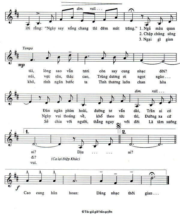 … nhưng qua câu thứ hai thì lại lòi ra cung Fa (ở chỗ thuyền trôi) nghĩa là từ thang âm ngũ cung Sol La Do Ré Mi chuyển qua thang âm ngũ cung Do Ré Fa Sol La: