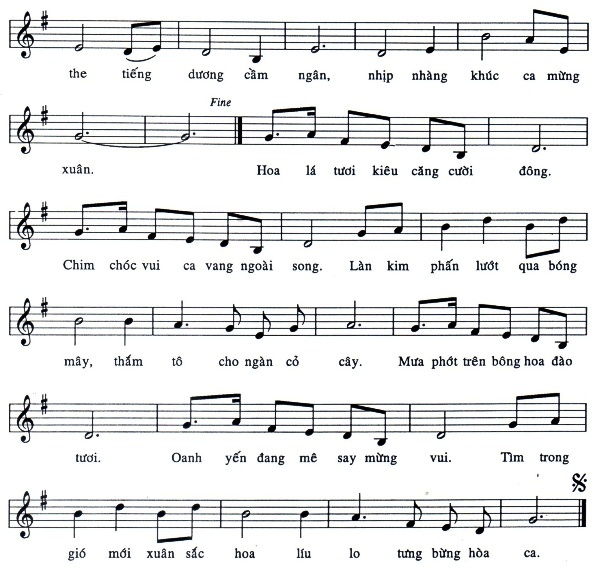 – Dạ, cũng ngay trong bản “Xuân về” chứ có đâu xa. Đoạn áp chót như thế này: “Làn kim phấn lướt qua bóng mây, thắm tô cho ngàn cỏ cây…”