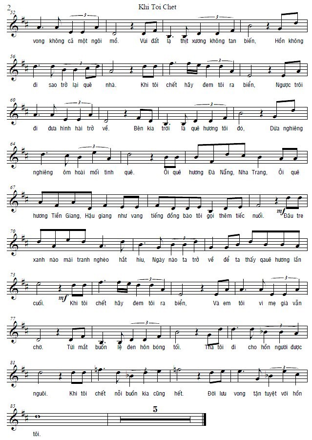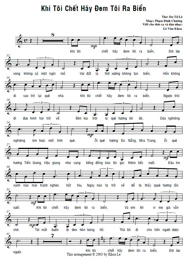 và: khi tôi chết hãy đem tôi ra biển/đời lưu vong không cả một ngôi mồ/vùi đất lạ thịt xương e khó rã/ hồn không đi, sao trở lại quê nhà khi tôi chết hãy đem tôi ra biển/nước ngược dòng sẽ đẩy xác trôi đi/bên kia biển là quê hương tôi đó/ rặng tre xưa muôn tuổi vẫn xanh rì khi tôi chết hãy đem tôi ra biển/và nhớ đừng vội vuốt mắt cho tôi/cho tôi hướng vọng quê tôi lần cuối/biết đâu chừng xác tôi chẳng đến nơi…