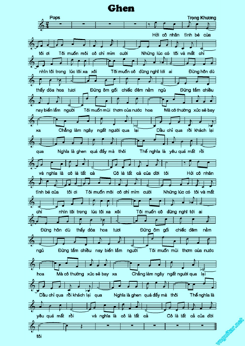 Ghen là một nhạc phẩm nổi tiếng khác của nhạc sĩ Trọng Khương. Bài hát viết nguyên thủy theo điệu Fox, thật vui và dễ … yêu. Đây là bài tình ca do Trọng Khương phổ nhạc vào thơ Nguyễn Bính. Nhạc của Trọng Khương đã diễn tả được đúng ý vui nhộn của thi sĩ Nguyễn Bính, diễn tả một chàng si tình và… ghen.