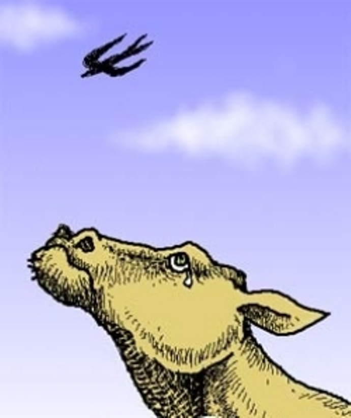Trên đường đi tới chợ, con bê luôn miệng than thở cho số phận bi thảm của mình, và so bì với con chim sẻ đang tung cánh bay trên bầu trời, và gió thì cứ cười đùa lả lơi trước sự nghiệt ngã, bất công ấy.