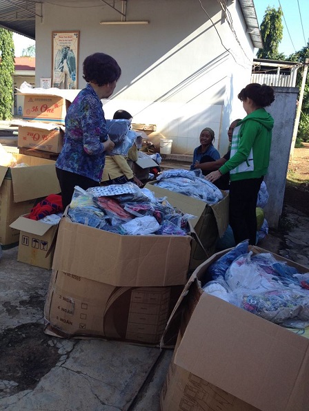 2/ Trước cổng sau của giáo xứ Buôn Hằng, các mẹ thuộc giáo họ Chí Hòa Tp. HCM đang phân chia áo quần mới, để chia sẻ với anh em Buôn Hằng mùa hè 2016.