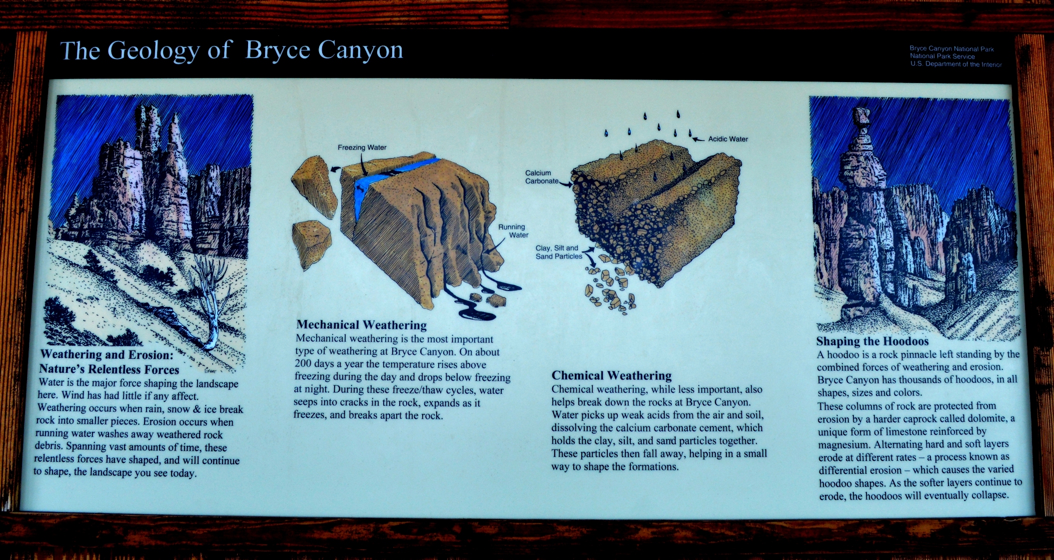 Địa thế Bryce Canyon rất đặc biệt nhờ chứa đựng những tượng đá hoodoos, tức là các cột đá với nhiều hình thù và màu sắc khác nhau, hình thành do thời tiết băng lạnh và bào mòn bởi nước sông và nệm đá phù sa. Màu đỏ, màu cam, và màu trắng của đá cho du khách những hình ảnh ngoạn mục đẹp mắt chưa từng có.