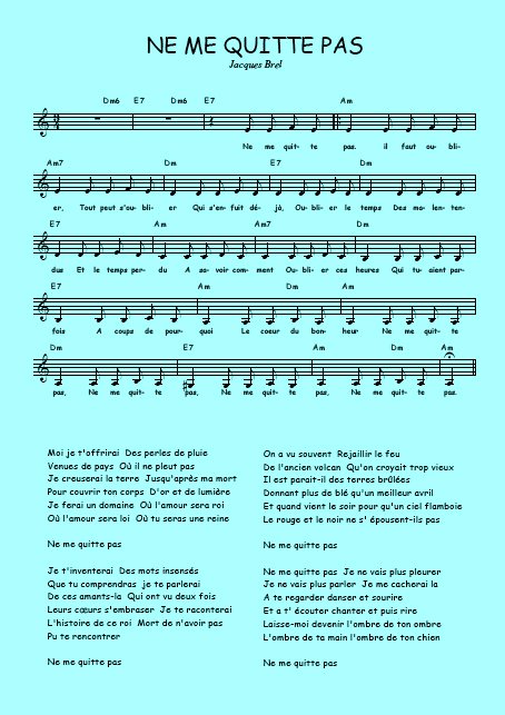 “Ne me quitte pas” được phần đông ghi nhận là bài hát kinh điển của Jacques Brel, được viết sau khi tình nhân của ông, Zizou (Suzanne Gabriello), rời bỏ ông. Ông thu âm bài hát ngày 11 tháng 9 năm 1959, và được phát hành trong album thứ tư “La Valse à Mille Temps” của ông do Warner-Chappell Publishing xuất bản.
