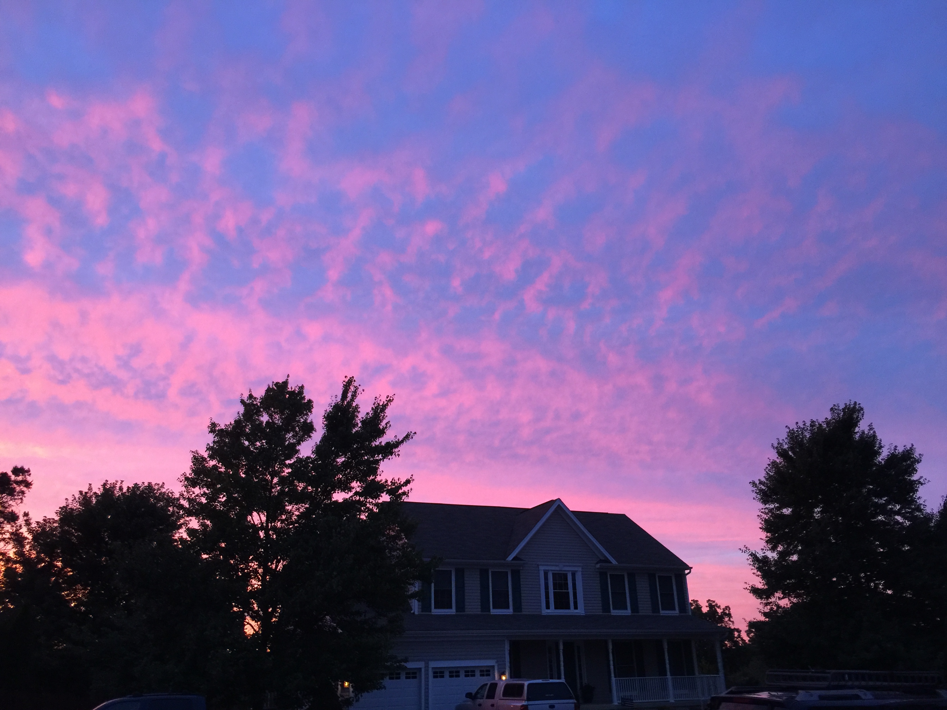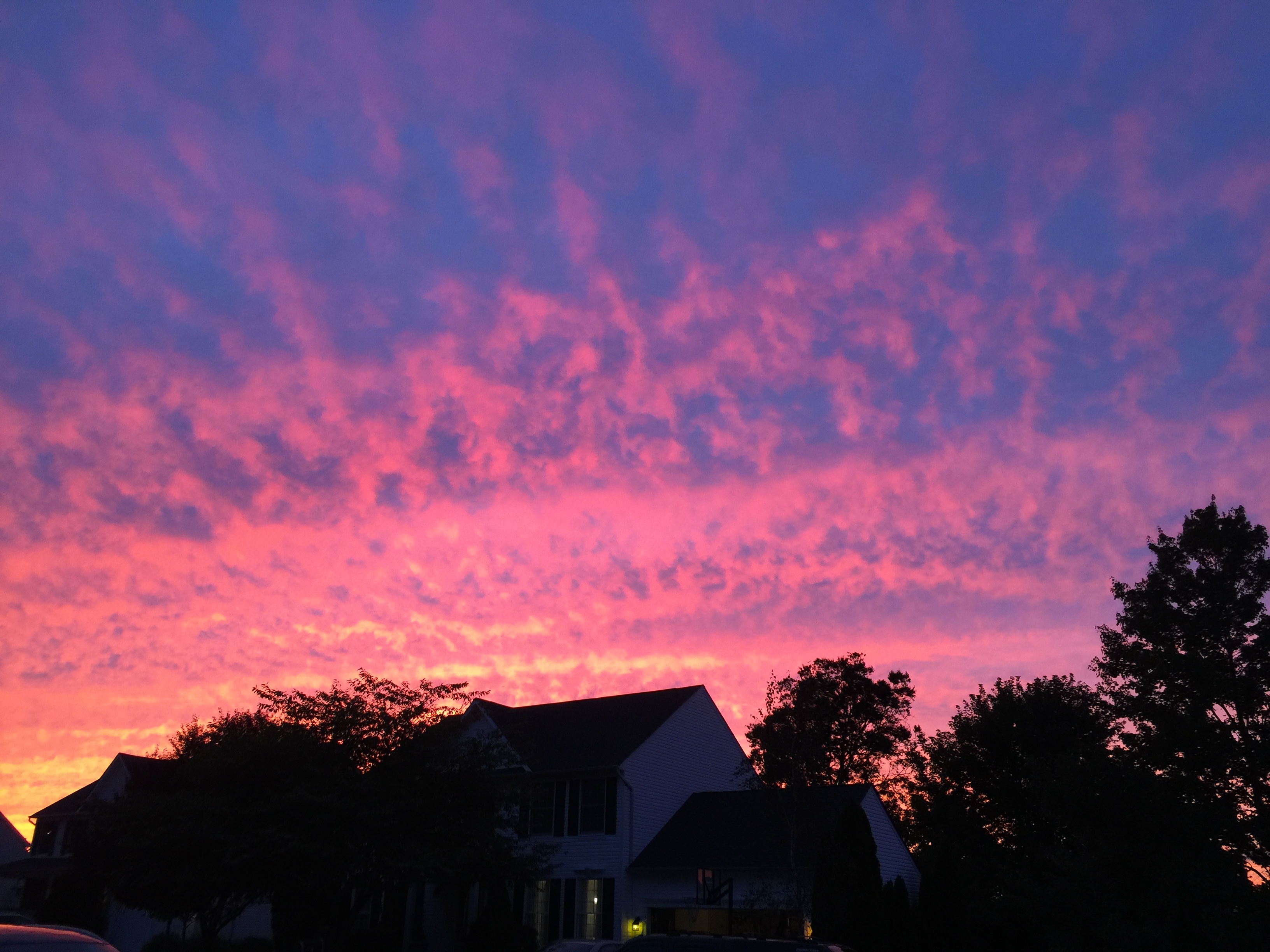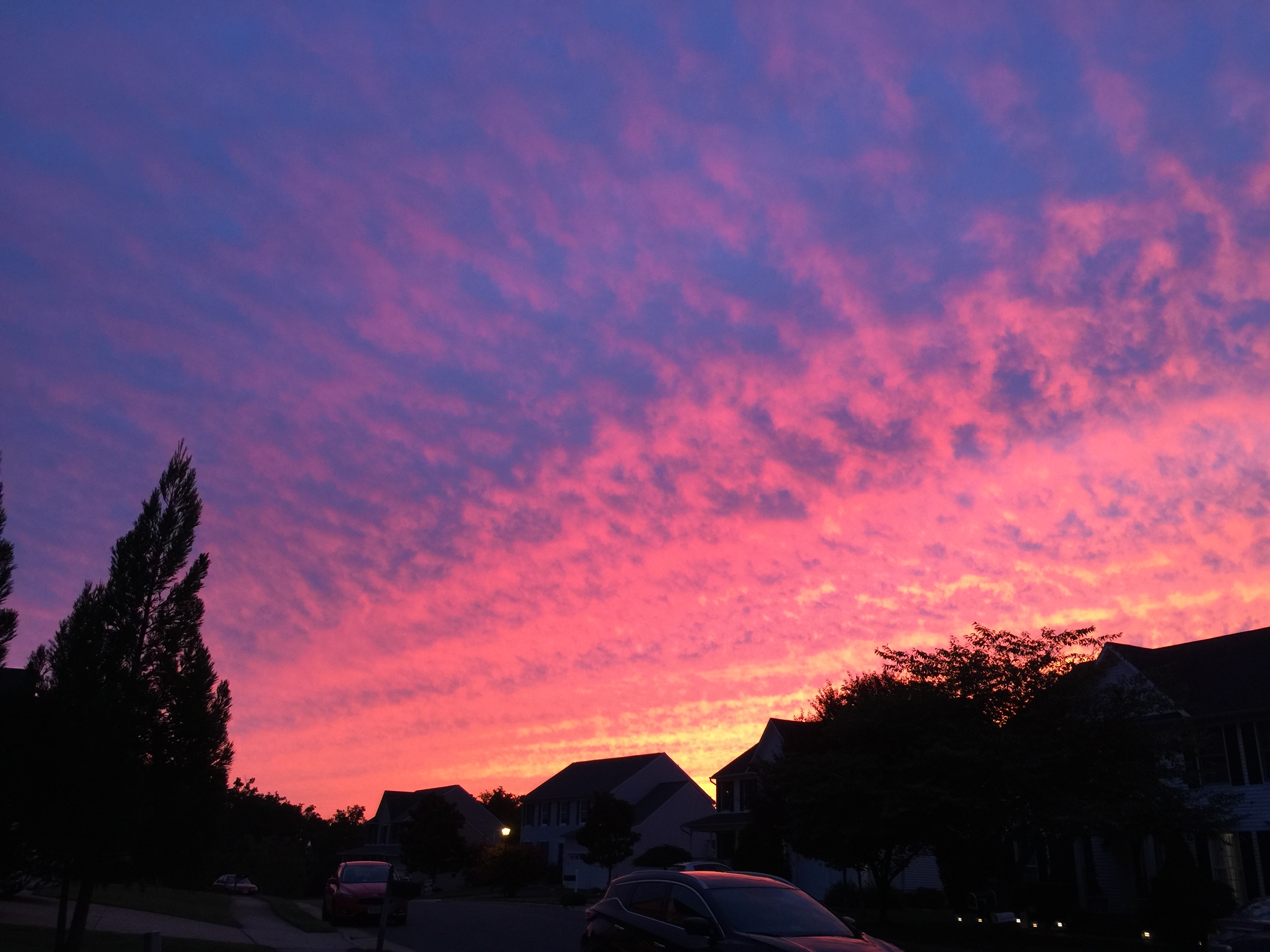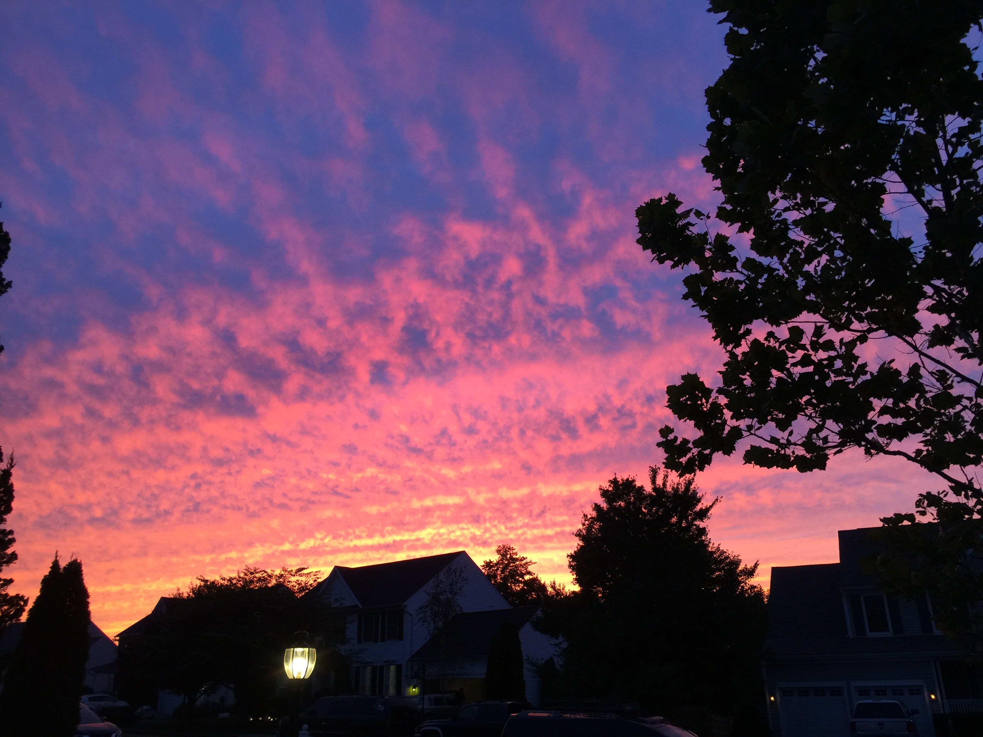 Khoảng 7:30 pm chiều nay (thứ sáu, 2 tháng 9, 2016) mình đang loay hoay trong bếp với một số việc. Bất chợt mình thấy có một màu hồng cam dị thường đang chiếu lên hai tay mình sáng rực thông qua cửa sổ. Ngước nhìn ra ngoài thì cả bầu trời trước mặt mình đang bao phủ bởi tuyền màu hồng cam dị thường này. Nhận ra ngay đó là trời đang hoàng hôn và ánh sáng cuối cùng trong ngày sắp tắt, mình bèn chụp lấy cái phone của mình chạy ra sân trước để tác nghiệp.
