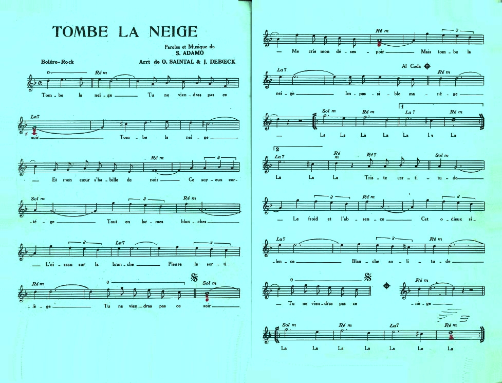 Nhạc phẩm “Tombe La Neige” do ông sáng tác và trình diễn lần đầu vào năm 1963. Mặc dù nhận được những lời khuyến cáo của nhà sản xuất là nên phát hành bản nhạc này vào mùa đông năm ấy nhưng Adamo vẫn cho ra mắt vào mùa hè năm 1963. Sau đó bài hát thành công nổi tiếng khắp thế giới và được nhiều danh ca thu âm bằng nhiều ngôn ngữ khác nhau như: Bulgarian, Turkish (“Her Yerde Kar Var”), Japanese, Portuguese, Spanish, Italian, Chinese (“Cantopop”).
