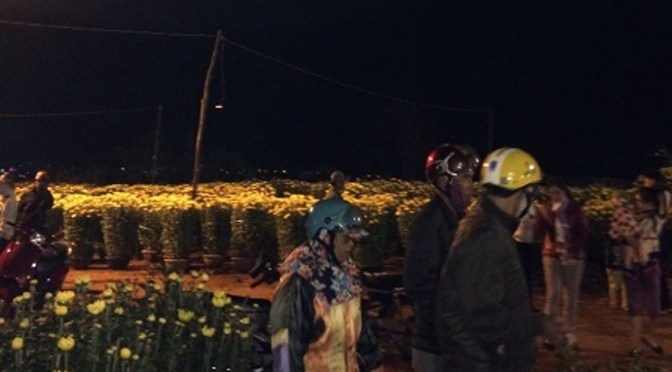 Vì còn hơn hai giờ mới đến giờ đón giao thừa nên mình ra xe đi với em Thùy và cháu Đạt, sau một lúc dạo chơi em Thùy cho xe chạy vào cổng chợ hoa tết, lúc này đã trên tám giờ tối nhưng người vô ra vẫn còn tấp nập, và số chậu hoa cúc cũng như những chậu quất chưa bán được còn lại rất nhiều. Mình đang nghĩ không biết người ta phải làm sao với số hoa số cây cảnh còn lại, thì nghe phía đối diện phát ra những tiếng đập rất mạnh, em Thùy nói: