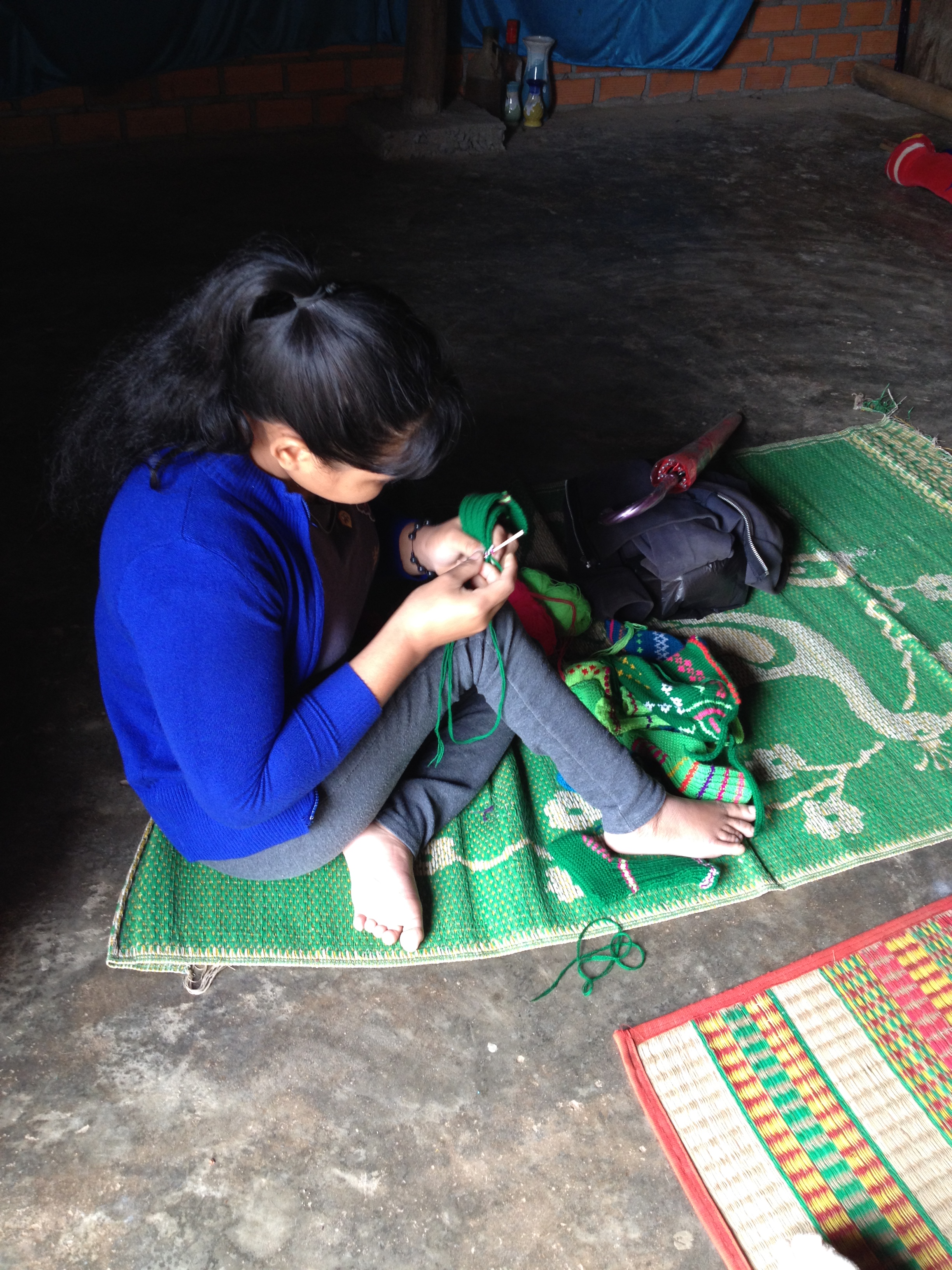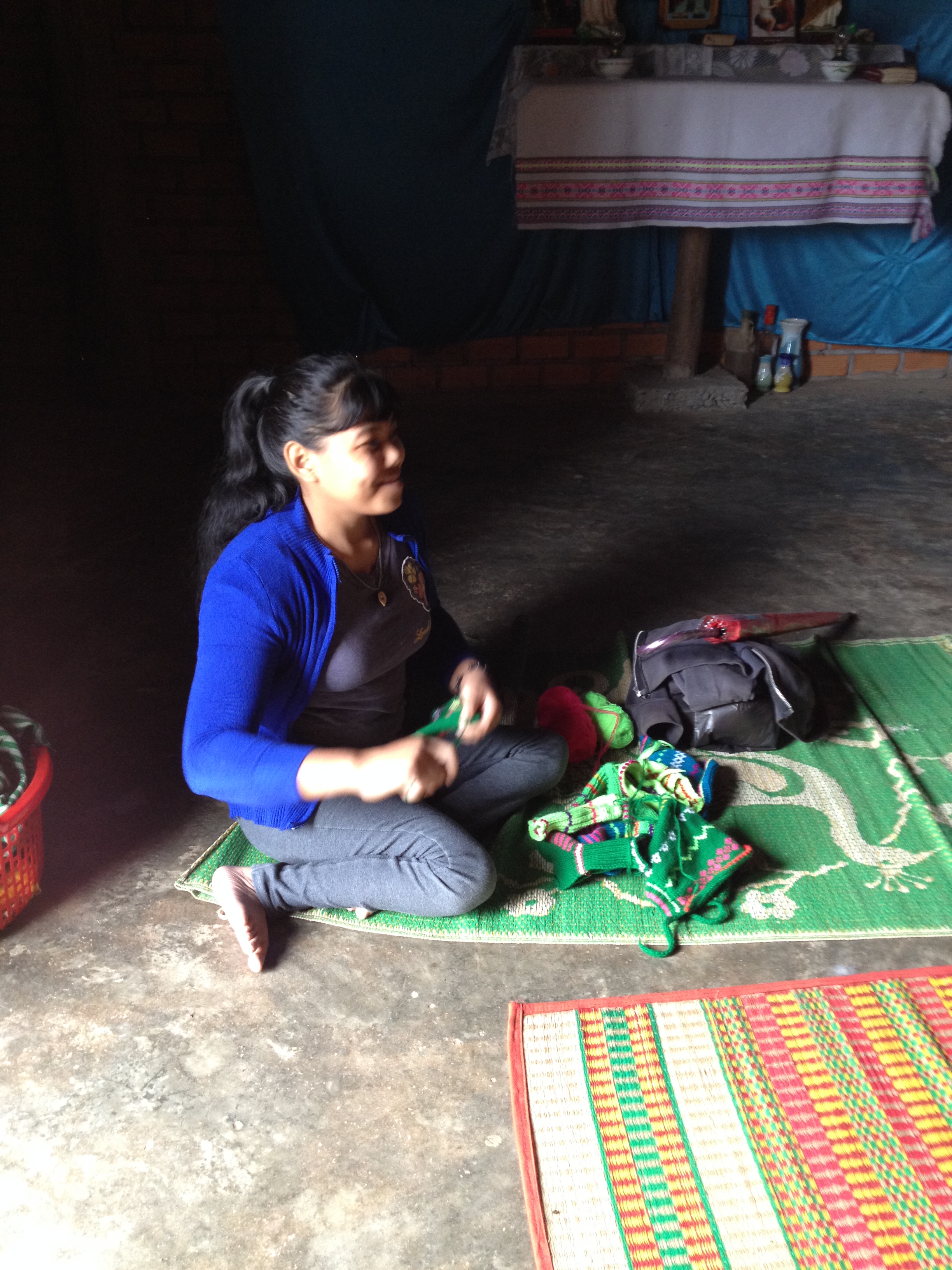 2/ Ảnh em Thuật ở thôn Tư liệt hai chân đang ngồi đan mũ và những đôi dớ em bé _ Buôn Hằng3/ Ảnh em Thuật rất vui trước những chiếc mũ và những đôi dớ em Thuật đã đan được _ Buôn Hằng