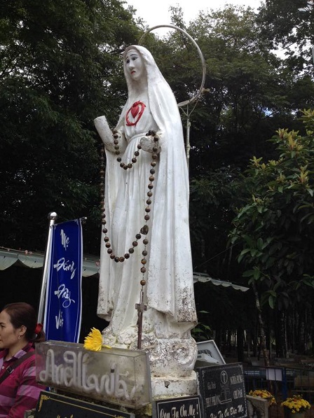2/ Điểm đặc biệt: Tượng Đức mẹ Măng Đen không có hai bàn tay. Rất nhiều du khách hành hương đã đặt và ráp hai bàn tay cho tượng Đức mẹ nhưng không được! Bởi ráp vào là rớt xuống bể. Rất nhiều lần như vậy nên mọi người tin là Mẹ muốn như vậy và để theo ý Mẹ.3/ Khách hành hương tin và đến khấn rất nhiều. Rất nhiều người được ơn của Mẹ bởi chung quanh tượng đài cũng như bục Mẹ đứng gắn rất nhiều tấm bia Tạ ơn Mẹ.