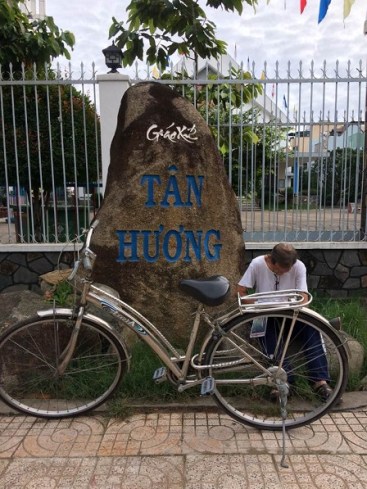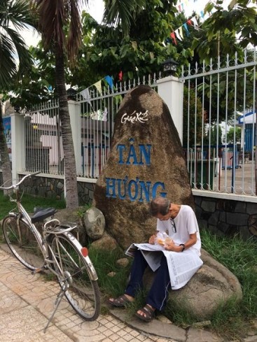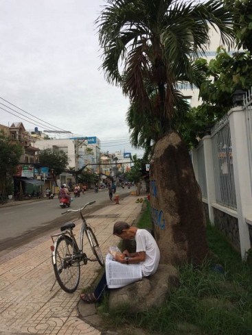Sáu giờ sáng ngày 16/ 08/ 2017 mình đi ngang qua nhà thờ giáo xứ Tân Hương, trên đường Tân Kỳ Tân Quí Tp. HCM. Mình nhìn thấy phía ngoài cổng nhà thờ trên phiến đá trang trí trước cổng, một ông cụ trên bảy mươi tuổi ngồi vừa ăn bánh mì vừa chăm chú đọc báo bên cạnh chiếc xe đạp của cụ.