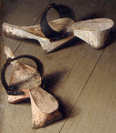 Khoảng 1400s, gỗ và daThế kỷ 18, da và sắtPattens lớn, hai phụ nữ Turkish ở thế kỷ 18, do Jean-Étienne Liotar vẽ bằng bút chì màu, khi thăm Turkey năm 1738Chân dung Arnolfini và Vợ, do họa sĩ Hà Lan Jan van Eyck vẽ năm 1434 bằng sơn dầu trên bản gỗ. Bức tranh này được xem là sáng tạo và phức tạp nhất trong nghệ thuật Tây phương thời đó. Trên sàn nhà có đôi pattens phóng đại dưới đây.Đôi pattens trong bức tranh Arnolfini và Vợ.Bức tranh khắc trên gỗ Đôi Tình Nhân, của Master E.S., thời 1460s. Pattens của chàng rất dài, mỗi chiếc có hai mũi nhọn trước đầu như hai thanh kiếm (chắc là dùng như vũ khí). Chàng đã hấp tấp vất bỏ patten ở chân trái ra (chân vẫn còn mang vớ), và nàng vẫn còn mang pattens.Môt đôi highheels 2018, chỉ có các cô các bà mang.