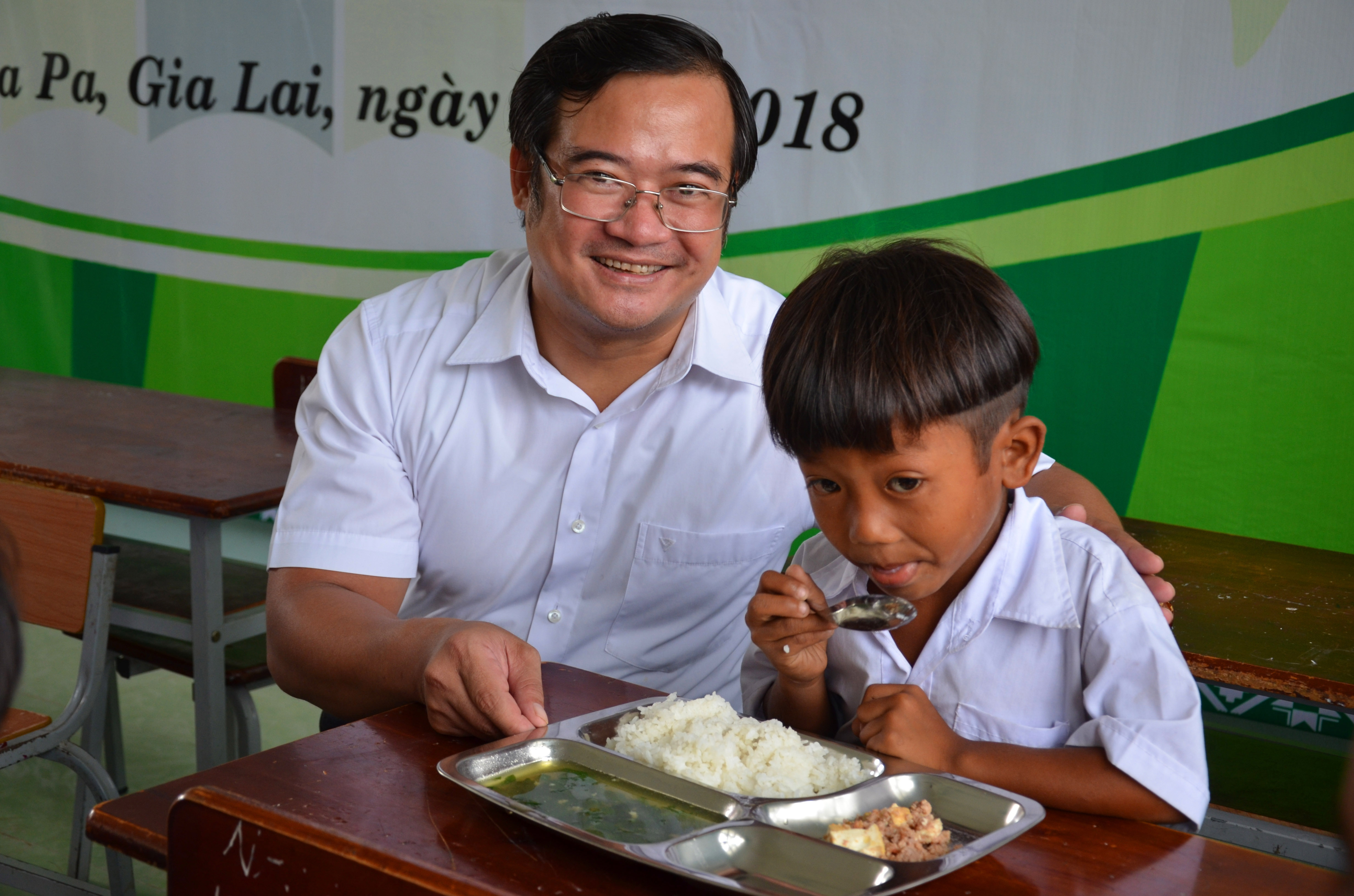 Đồng hành cùng thầy giáo Trần Đăng Khoa, hiệu trưởng trường tiểu học Kim Đồng-người đã hiến 100 triệu đồng tiền tiết kiệm của gia đình để lập bếp ăn trưa cho học trò lớp Một mà không đủ, báo Tiền Phong cùng Quỹ Trò Nghèo Vùng Cao đã vào cuộc hỗ trợ. Và chương trình “Cơm Có Thịt” trên Tây Nguyên đã được triển khai, bắt đầu từ ngày 1/10/2018
