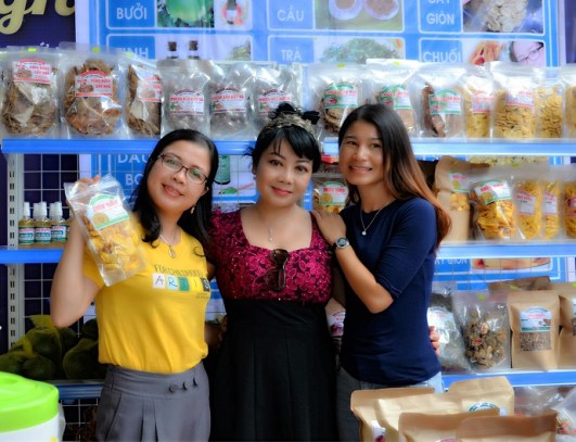 Anh Hồ Văn Hoan-Chị Đặng Thị Mai là chủ quầy hàng Hội LHPN huyện Ea Hleo- Cơ sở chế biến sản phẩm sấy khô và tinh dầu Mai Đặng. Quầy trưng bày 15 mặt hàng gồm các loại trái cây, củ quả sấy, các loại trà, các loại tinh dầu. Chị Mai kể: Chị là kế toán Trung tâm chính trị huyện, thu nhập thua chồng là anh Hoan thuần túy nông dân với 3 ha rẫy trồng cây ăn trái. Thấy bán sản phẩm tươi giá thấp mà lại mau hỏng, anh chị đã tự học cách sấy rau củ quả chất lượng cao. Học trên mạng, trong sách, bạn bè và tham khảo ở các mô hình thành công ở các tỉnh khác. Sau thời gian tập sấy sản phẩm thu từ vườn nhà, anh chị đã thu mua nguyên liệu khối lượng ngày càng lớn, vì đã nắm được bí quyết sấy ngon được rất nhiều thứ nông lâm thổ sản, như bơ, măng, mãng cầu, thanh long, mít, chuối, rồi tiến lên sản xuất cả tinh dầu bơ, bưởi. Nhận được một phần hỗ trợ từ Hội Phụ nữ huyện, Mai Đặng nay đã sắm được 3 máy sấy, mỗi máy giá khoảng 70 triệu đồng. “Hàng Việt Nam thôi, nhưng mình mua từ Sài Gòn về độ chế lại, bỏ hết các khay bằng sắt, thay bằng khay Inox bảo đảm không độc hại. Hàng nay đã bán được khắp cả nước nên cứ ngày sản xuất, chiều đến là tập trung đóng gói, gửi cỡ 1 tạ hàng lên xe khách chở đi. Hàng ngon, sạch, rẻ, mỗi ngày trừ chi phí mình lãi khoảng 1,5 triệu đồng, trả lương cho 4-5 phụ nữ trong thôn mỗi người 200-250 nghìn đồng một công.”