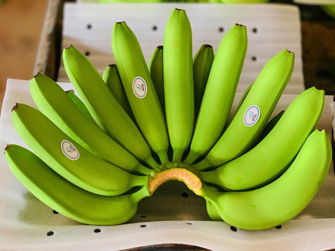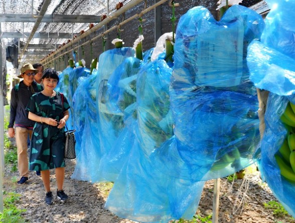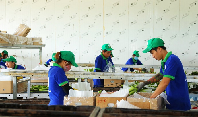 Tại khu sơ chế, buồng chuối được cắt thành từng nải, qua 4 bể rửa, phân loại kiểm tra, cân đủ 13 kg chuối cho mỗi thùng, hong khô, xếp xốp, bao lót đóng gói cẩn thận trước khi chuyển vào kho lạnh bảo quản. 250 nông dân địa phương đã được nhận vào làm việc tại đây với mức lương từ 4,7- 5,3 triệu đồng/người/tháng. Một nhóm nữ công nhân đang vui vẻ cơm trưa cho biết mức thu nhập này ở xã vùng sâu là rất tốt, “đủ giúp gia đình chúng tôi có cuộc sống ổn định”.