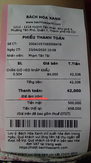 Mình nói chuyện này với bạn mình và bạn mình cũng đồng ý là có vấn đề. Và bạn mình chia sẻ kinh nghiệm mua sắm ở Bách Hóa Xanh. Dưới đây là hóa đơn bạn mình mua sắm ở Bách Hóa Xanh mà bạn mình gửi cho mình. Các bạn sẽ thấy giá mua hàng là 42.336 đồng, và BHX “làm tròn” nó thành 42 ngàn đồng chẳn. Và đương nhiên tiền thối lại rất chẳn chòi cho khách hàng.