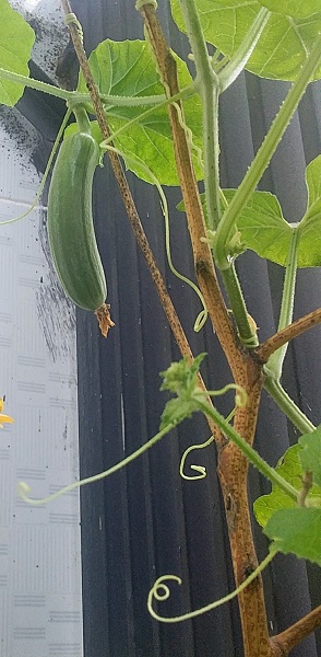 Khi 1 quả đầu tiên đậu thành công, bạn mình nói đây là quả dưa leo, hay còn gọi là dưa chuột. Mình thì vẫn đoán nó là mướp vì thấy có sọc. Thực ra trước đó có 1 quả đậu rồi nhưng đã héo chết non.