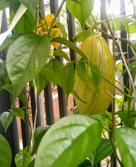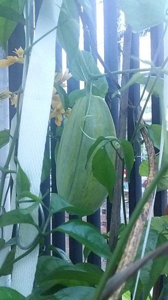 Đến những ngày gần đây thì tụi mình phát hiện ra quả đó không phải bầu, hay bí, chẳng phải mướp hay dưa leo, mọi phỏng đoán đều trật. Cây leo đó là cây dưa gang hay còn gọi là dưa bở. Vui quá đi, tụi mình chưa bao giờ trồng được một cây dưa gang, lại còn cho ra cả quả. Thật là Trời cho. Tụi mình đang chờ quả dưa gang này to, chín rồi tính xem làm gì tiếp 😀