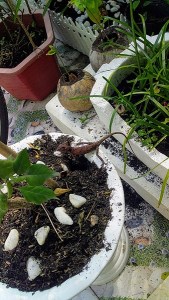 Sáng nay ra sân thấy một đống đất vung vãi từ chậu hoa nguyệt quế tụi mình vừa mua trồng hôm trước. Mình chẳng hiểu sao, và nghĩ là do đám chim sâu như trước nay mình vẫn tưởng vậy khi có đất vung vãi trong sân. Nhưng không phải. Nhìn kỹ thì thấy có một kẻ đang đào bới, thấy mình đến gần thì đứng im, dường như không có chuyện gì xảy ra. Rồi khi mình theo dõi, chụp hình, quay phim “bắt quả tang”, hắn liền bỏ dở việc đào bới và chạy đi chỗ khác.