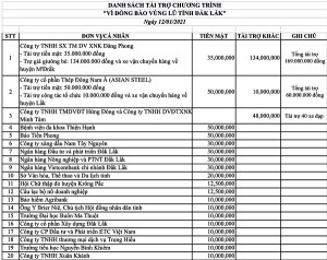 Ban tổ chức Chương trình “Vì đồng bào vùng lũ tỉnh Đắk Lắk” trân trọng cảm ơn 176 tập thể, cá nhân, doanh nghiệp đã đóng góp tiền, quà cho chương trình, tổng cộng 780,5 triệu đồng. Trong đó, Công ty TNHH SXTMDV XNK Đăng Phong tài trợ 169 triệu đồng tiền mặt và trợ giá giường bè, xe chở hàng; Công ty CP Thép Đông Nam Á tài trợ 60 triệu đồng và xe chở hàng. Bệnh viện ĐK Thiện Hạnh, báo Tiền Phong tài trợ 50 triệu đồng; Công ty TNHH TMDVĐT Hừng Đông và Công ty TNHH DVĐT XNK Minh Tâm tặng 40 xe đạp. Công ty Xăng dầu Nam Tây Nguyên, BIDV Đắk Lắk, Agribank Đắk Lắk, VCB Đắk Lắk mỗi đơn vị tài trợ 30 triệu đồng. Sở VH-TT-DL tài trợ 20 triệu đồng v.v…