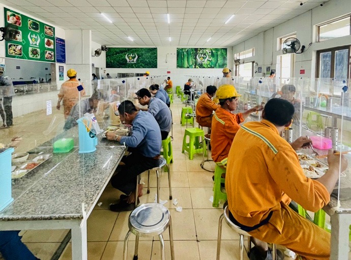 “Đột nhập” nhà ăn sạch đẹp, nhiều dãy kính chắn ngăn cách, chúng tôi cảm nhận được sự chăm lo chu đáo đời sống người lao động của doanh nghiệp này. Ông Nguyễn Minh Hải -Trưởng phòng Hành chính Nhân sự Công ty CP Thép Đông Nam Á cho biết: Để đảm bảo dây chuyền sản xuất không bị đứt gãy vì dịch bệnh, Công ty đã chia ca đi làm, đảm bảo 2 ca không tiếp xúc với nhau, tuân thủ “1 cung đường 2 điểm đến”. Người lao động tự mang cơm theo, tạm dừng bếp tập thể để hạn chế tiếp xúc. Ở mảng nhập xuất hàng hóa, lái xe đăng ký luồng xanh, luôn có giấy test nhanh hiệu lực trong 72 giờ. Dù “bí” mấy, lái xe cũng phải ngồi trên ca bin trong suốt thời gian nhập xuất hàng, không được bước xuống. Chính vì vậy, dù sản lượng thép do Công ty sản xuất chỉ đạt bình quân 50% so với 2 năm trước vì đại dịch, nhưng đội ngũ công nhân của Công ty vẫn được bảo đảm việc làm, thu nhập.