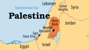Diện tích Palestine hiện tại (màu cam) sau khi bị Israel lấn chiếm, gồm dải Gaza và West Bank. Lebanon ở phía bắc của bản đồ.