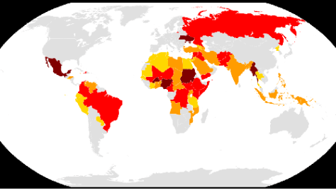 Map of ongoing armed conflicts (number of combat-related deaths in current or previous year): Major (10,000 or more, dark brown); Wars (1,000–9,999, red); Minor conflicts (100–999, orange); Skirmishes and clashes (1–99 yellow). Wikipedia