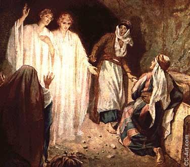 11 Now Mary stood outside the tomb crying. As she wept, she bent over to look into the tomb 12 and saw two angels in white, seated where Jesus’ body had been, one at the head and the other at the foot.