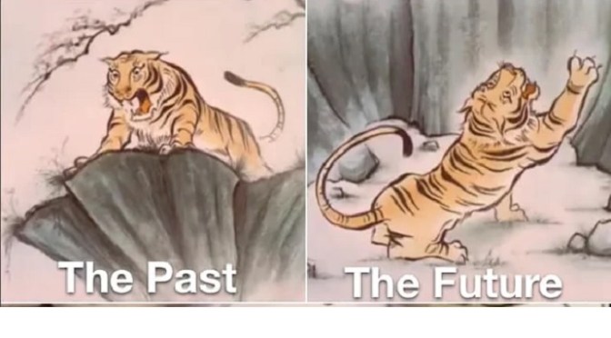 • The two tigers at the top and the bottom of the cliff represent the two limits of the human life. The tiger on the top is the past, or birth; the one at the bottom is the future, or death.
