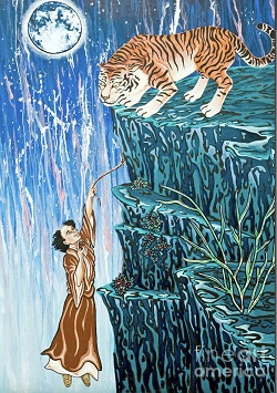 A man traveling across a field encountered a tiger. He fled, the tiger after him. Coming to a precipice, he caught hold of the root of a wild vine and swung himself down over the edge. The tiger sniffed at him from above. Trembling, the man looked down to where, far below, another tiger was waiting to eat him. Only the vine sustained him.