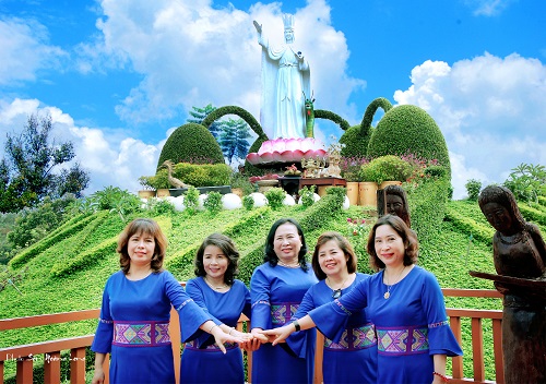 Không gian đặc biệt nhất ở Kotam, có lẽ là Đồi tưởng nhớ Quốc mẫu Âu Cơ. Cả quả đồi phủ cỏ lạc xanh biếc điểm hoa vàng li ti ôm lấy chân tượng đài thanh thoát vút cao, nổi bật trên nền trời xanh thẳm. Nét mặt Quốc Mẫu hiền hòa, vui tươi, dáng đứng mềm mại như đang ban phước lành cho con cháu. Chị Ngọc Anh giải thích các nữ chủ Kotam cảm thấy ấm áp, tự hào, như được khích lệ mỗi khi kính cẩn thắp hương dâng lên người Mẹ huyền thoại, ghi công đầu khai hoang, mở cõi cho nước Việt. Người góp ý tưởng giúp các chị tạo nên ngọn đồi tuyệt đẹp và đầy ý nghĩa này, chính là … ông xã chị, anh Lưu Tiến Vinh, nguyên Phó ban Tuyên giáo Tỉnh ủy Đắk Lắk, về hưu gần chục năm nay, hết lòng hỗ trợ bạn đời tiếp tục cống hiến cho xã hội.