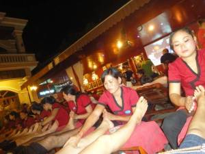 Ngủ một đêm ngon giấc sau ngày khởi hành cuồng chân trên xe bus, sáng thứ bảy 3 đứa tôi thức dậy sớm từ tận 4h để lo ăn sáng dưới nhà khách và lên xe tuk tuk đi tham quan một ngày khu di tích Angkor. Vì khu du lịch này chỉ có bán 2 loại vé tham quan, 20$ cho 1 ngày và 60$ cho 3 ngày liên tiếp nên chúng tôi mua vé đi một ngày và phải bắt đầu từ lúc sáng sớm để kịp ngắm cảnh mặt trời mọc ở đền Angkor Wat nổi tiếng. Khách sạn gọi dùm một anh lái tuk tuk đến đón chúng tôi lúc 5h sáng, và chỉ cần thỏa thuận chi phí bao xe cả ngày thì chúng tôi khởi hành. Anh lái đó sẽ chở chúng tôi đến đúng mấy nơi mà chúng tôi chọn và ở ngoài chờ khi chúng tôi vào trong xem cảnh, giống như dịch vụ thuê xe du lịch bình thường thôi nhưng không cao cấp bằng. Nhưng dù sao, mỗi thứ có cái hay riêng, đến Campuchia mà không sử dụng xe tuk tuk để đi du lịch thì cũng xem như chưa biết gì về Cam 🙂