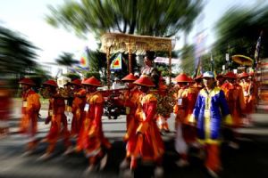 Chúng tôi bước vào Cửa Nam, có ba cổng. Hai cổng hai bên chỉ thấp nhỏ hơn cổng giữa một ít, độ chín với mười. Cổng thành xây cuốn, xếp đá theo hình múi cam. Từ Cửa Nam một con đường chạy thẳng ra Cửa Bắc. Người đi honda, người đi xe đạp, có tốp phụ nữ gánh gồng, có tốp học sinh đồng phục. Giữa đường, hai con rồng đá không còn nguyên vẹn. Chỗ ấy là bậc thềm cung điện xưa…