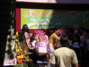 (**) H’Nghem đang bị bệnh khá hiểm nghèo, bữa đi hoc bữa không. Do xạ trị tóc em rụng gần hết, đến lớp im lặng không nói năng gì chỉ cắm cúi ghi ghi chép chép trông thật thương.